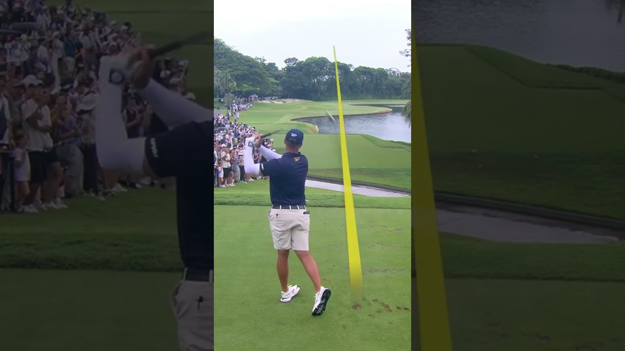"You could hear the crowd react," the commentator said. "Nothing wrong with the contact. Just comes up 30 feet short. Did take a little bit off the" - the clip cut before the commentator finished the point. Modern tour golf increasingly rewards the player whose mis-judged yardages still finish in playable positions, and Singapore's Sentosa layout, with its water-guarded greens and humid air that can play havoc with distance calculations, is the kind of course where a controlled short-miss is not a disaster.